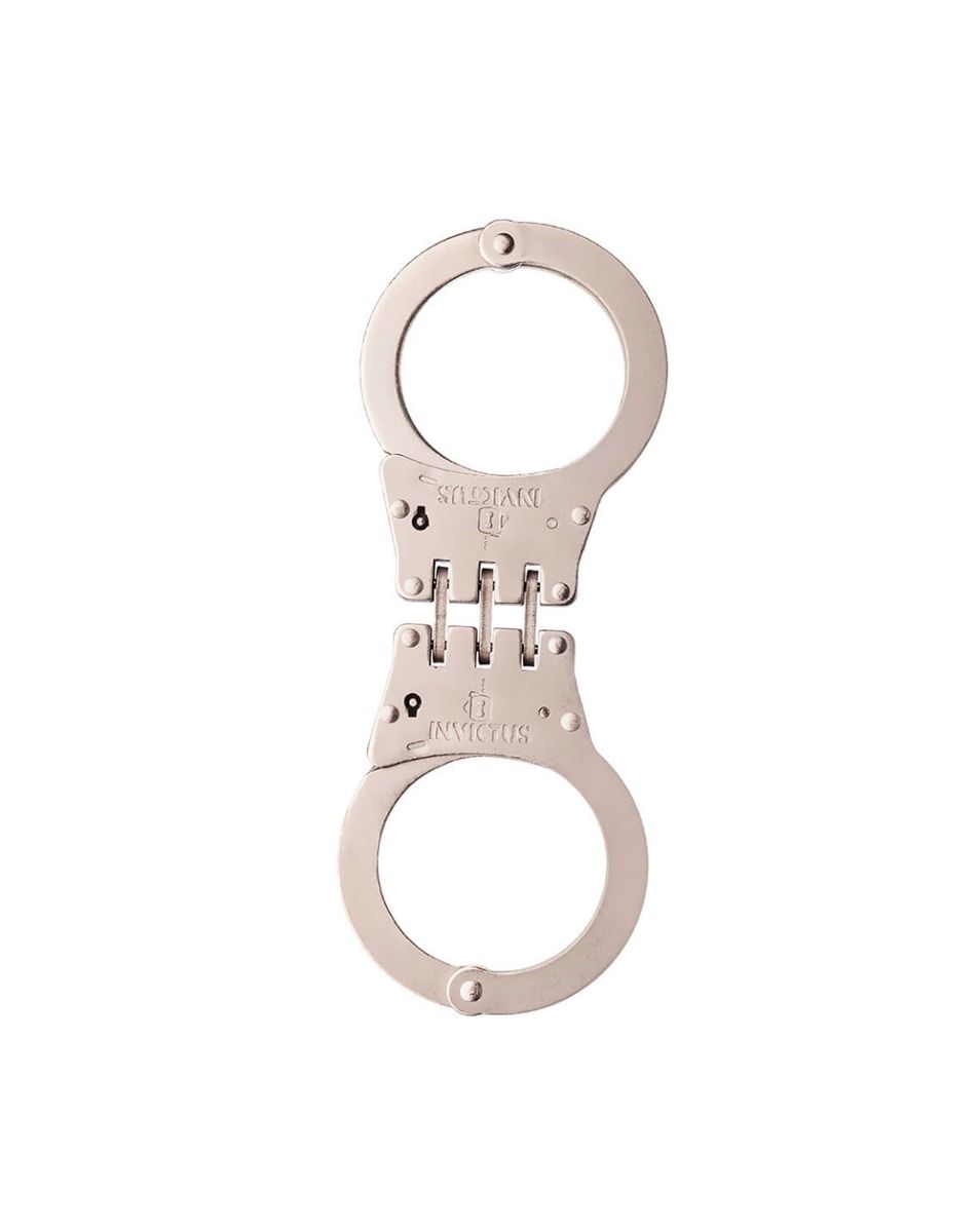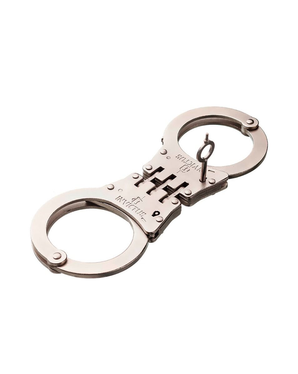 A Algema Dobradiça Invictus é um modelo de algema de pulso interligada por dobradiça e possui sistema de fechamento dentado através de catracas. O modelo conta ainda com mecanismo de segurança para evitar lesão no uso, acionado pela chave do produto. Fabricada em aço carbono AISI 1020, tem tratamento da superfície niquelado na cor prata, com acabamento fosco para adquirir a característica de antirreflexo. Acompanha duas chaves em aço carbono AISI 1020 na cor da algema.